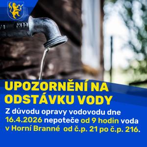 Z důvody rekonstrukce vodovodního řadu bude ve čtvrtek 16.4.2026 v části obce Horní Branná provedena odstávka pitné vody.