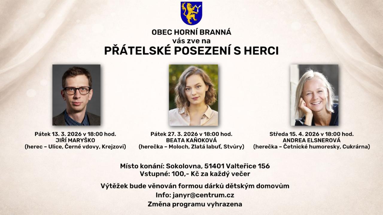 Obec Horní Branná Vás srdečně zve na "Přátelské posezení s herci". Pozváni přijali Jiří Maryško, Beata Kaňoková a Andrea Elsnerová.