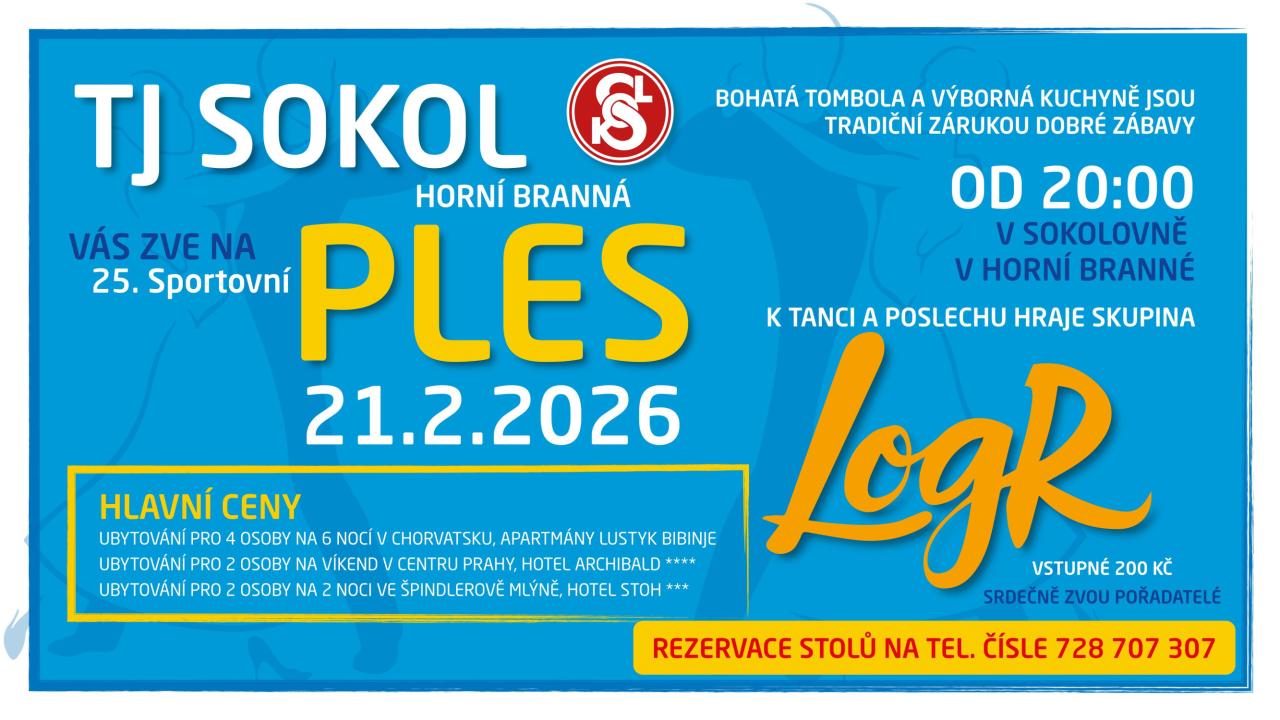 TJ Sokol Horní Branná vás zve na 25. Sportovní ples, k tanci a poslechu hraje LOGR.